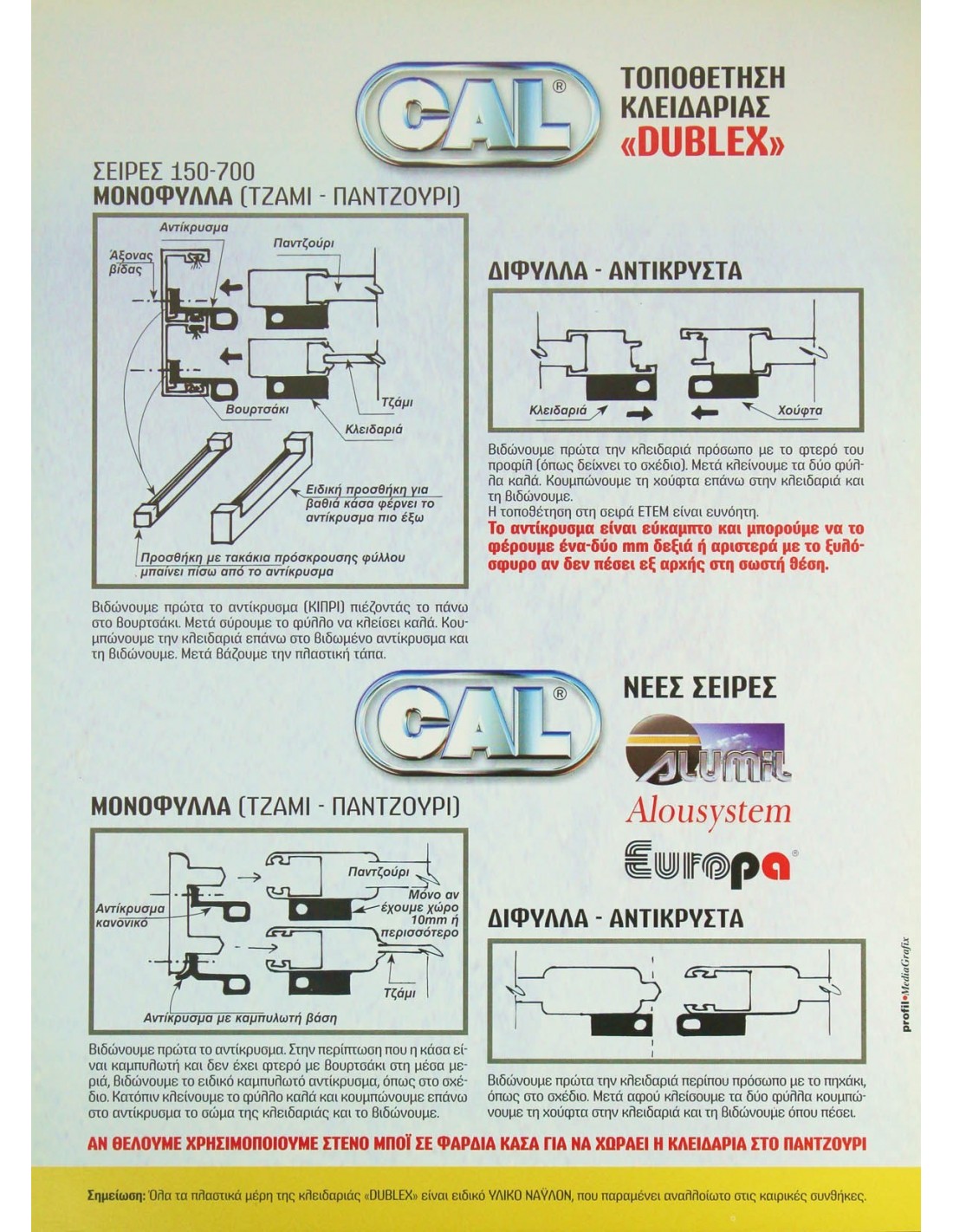 Η συσκευασία CAL DOUBLEX CLASSIC περιλαμβάνει 1 τεμάχιο που αποτελείται από: (α) κυρίως σώμα με τους 2 χαλύβδινους πίρους ασφαλείας, (β) πλαστικό κάλυμα, (γ) μικρή εξωτερική χούφτα, (δ) αντίκρυσμα που φωλιάζουν οι πίροι και (ε) 2 πλαστικές προεκτάσεις-αποστάτες που φέρνουν το κυπρί-αντίκρυσμα πιο κοντά στη κλειδαριά σε πιο βαθειά προφίλ.
