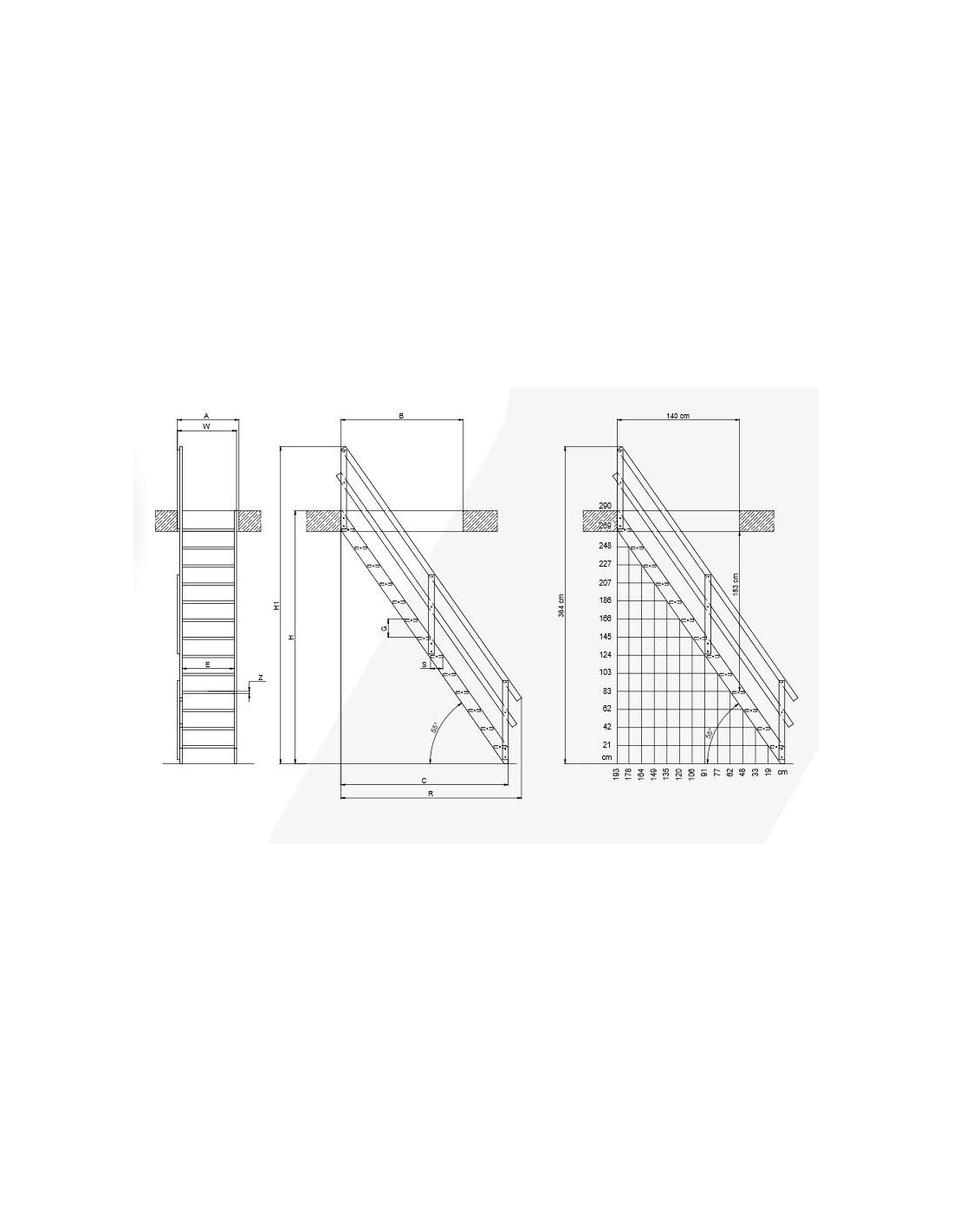 Μέγιστο ύψος ορόφου για τοποθέτηση 290εκ. Η κλίση της σκάλας είναι 55Ο και το επιτρεπόμενο βάρος φορτίου έως 160 κιλά.