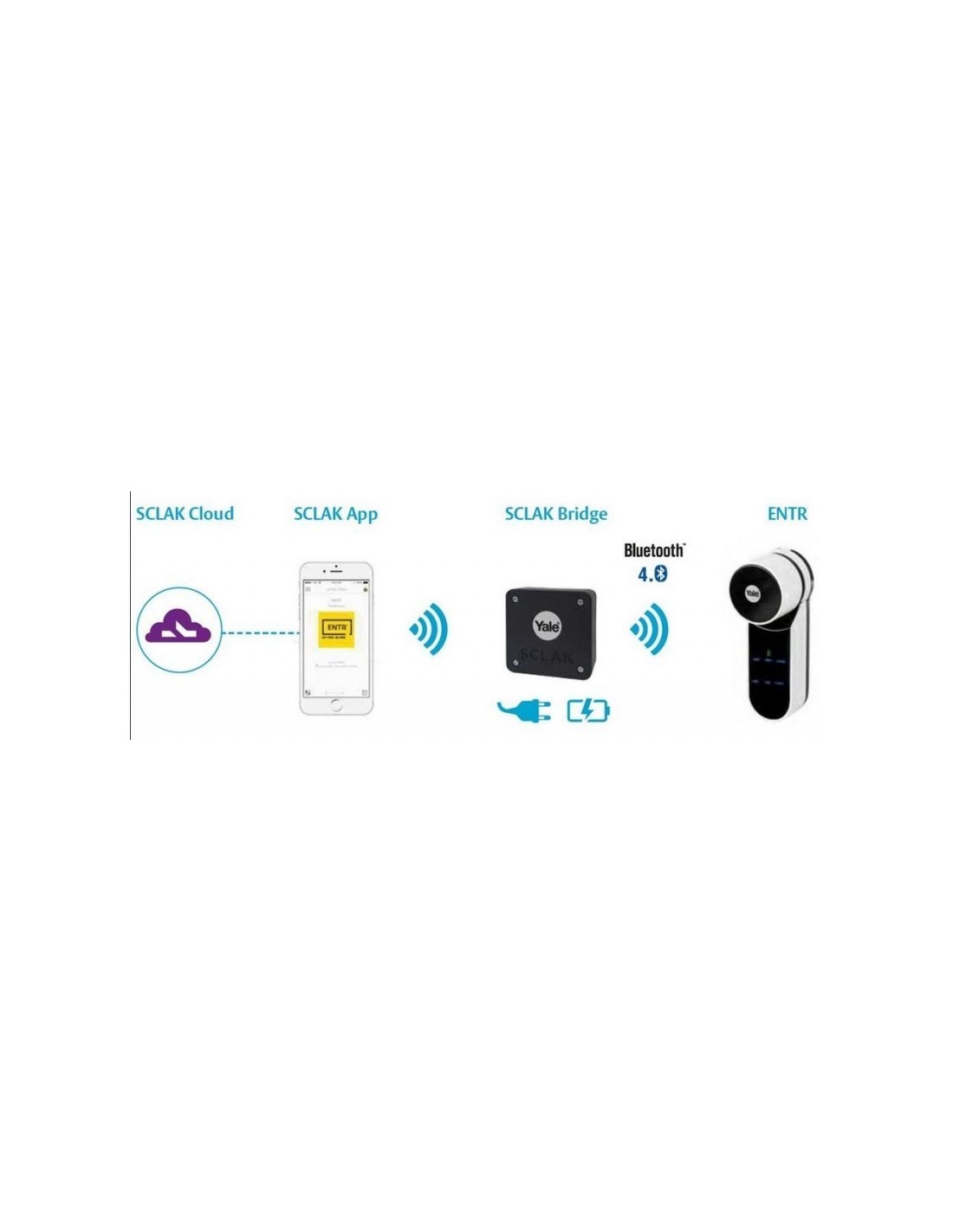 It is usually mounted on the inside of the door and communicates wirelessly with the Yale Entr. To open the door, the administrator sends an electronic key to the user's mobile phone. The user then through the application uses the electronic key to activate the SCLAK unit (via Bluetooth), which in turn commands the ENTR lock.