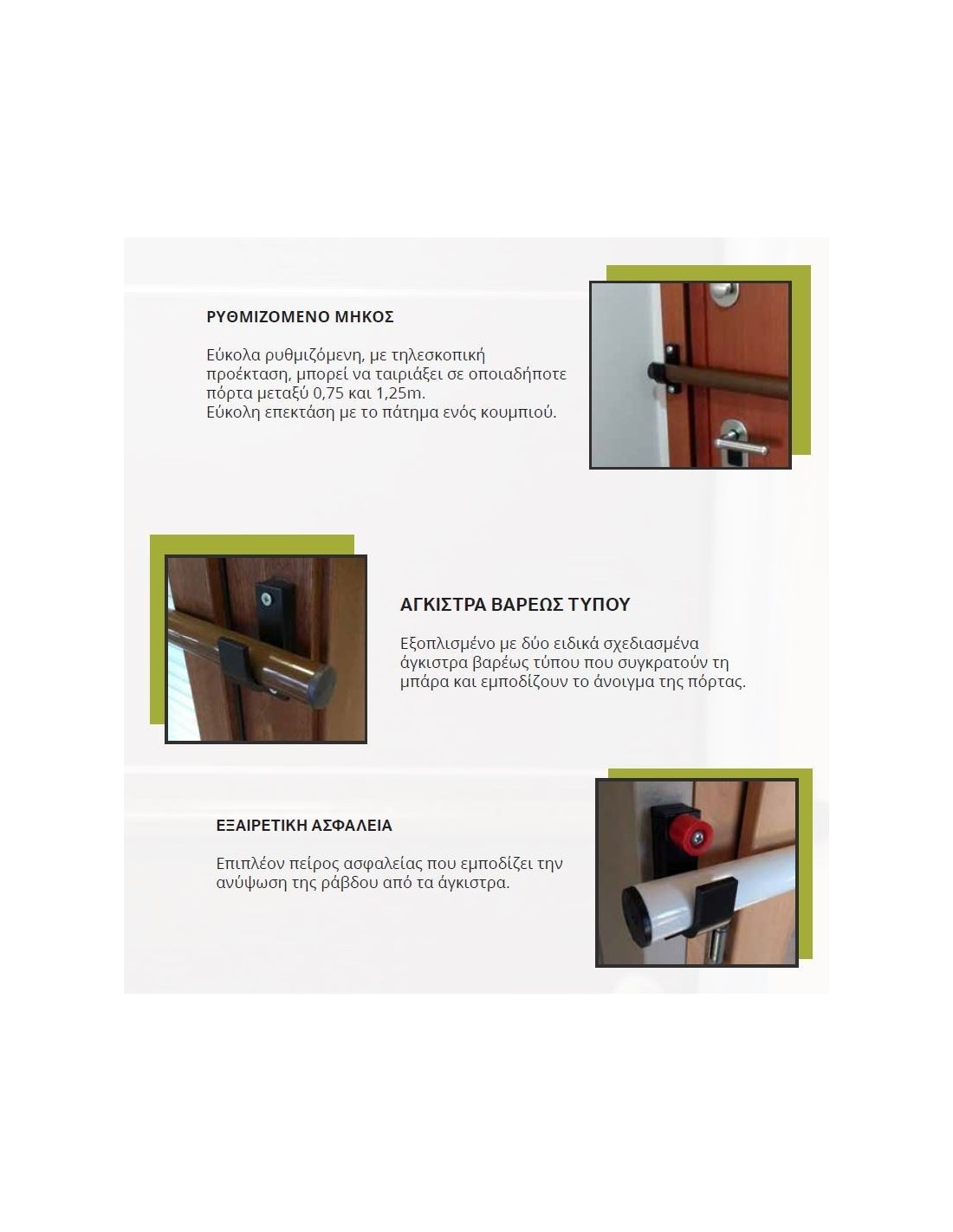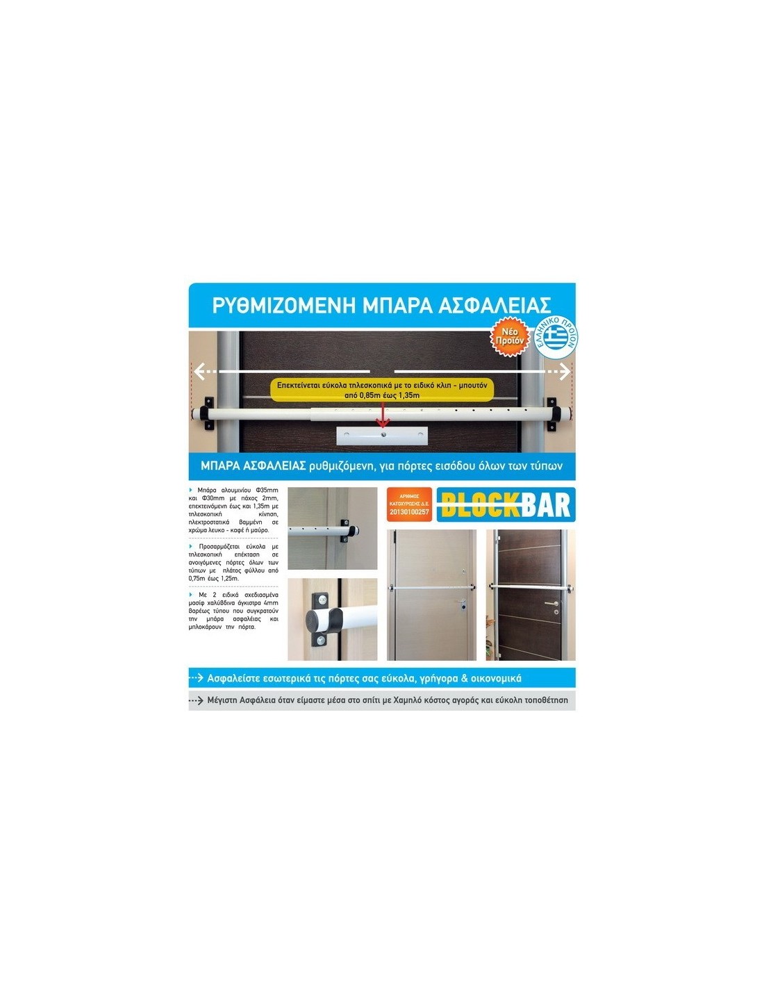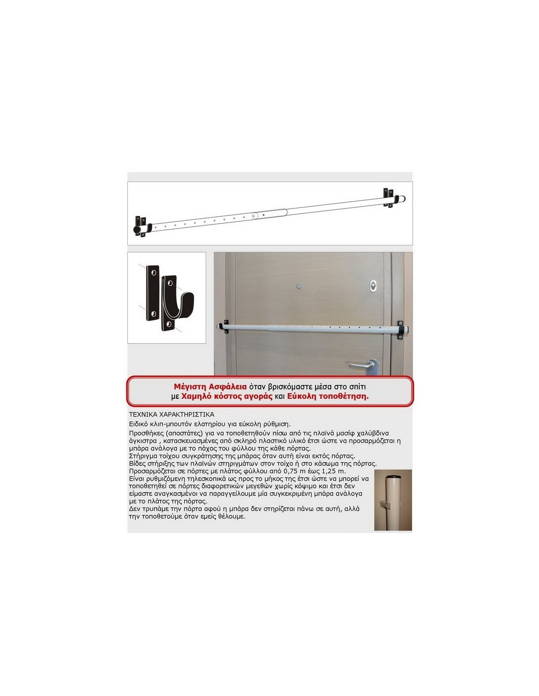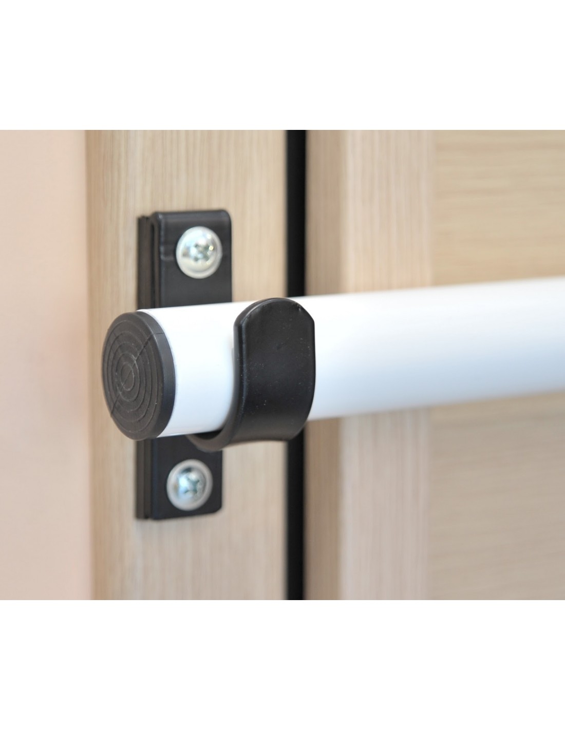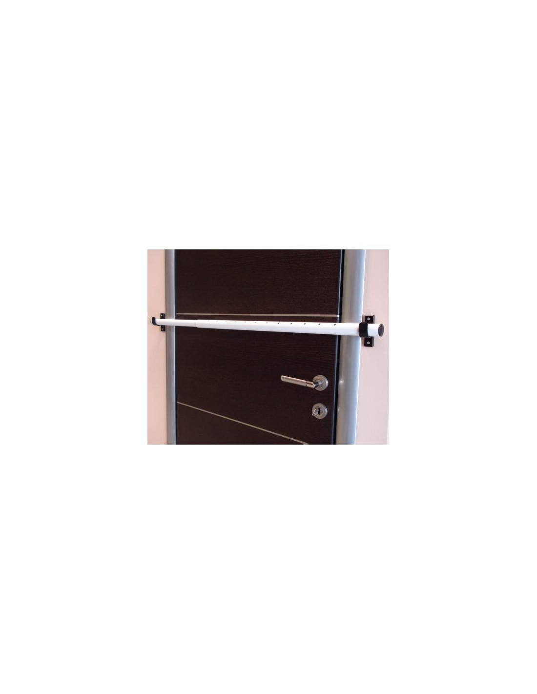 With 2 specially designed solid steel hooks 4mm heavy duty where hold the safety bar and block the door .
